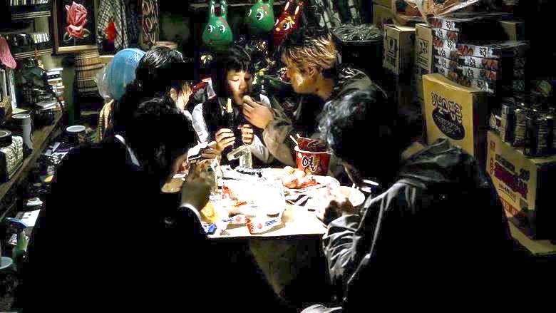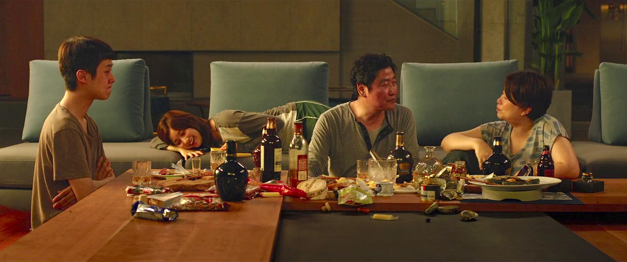 However, food becomes the tool the filmmaker uses to make the inequalities more visible and immediately understandable for the viewers. In their semi-basement, the Kims can only afford the cheapest mass-produced, packaged goods. When their son’s friend come to visit, they cannot offer him much, so that the two young men have to go out and share a cheap bottle of liquor on a wobbly little table near a corner store. To make some extra money, the Kims fold pizza boxes for a store which does not even want to pay them in full because of their shoddy job preparing the boxes. They are not only consumers of junk food, but they are also forced to participate in its production to survive. As they start to make money providing services to the Parks, the Kim’s eating habits change: they can finally order pizza, and later they chat while cooking meat on a table-top grill, using scissors to cut thin, sizzling slices as you would see at the restaurant.