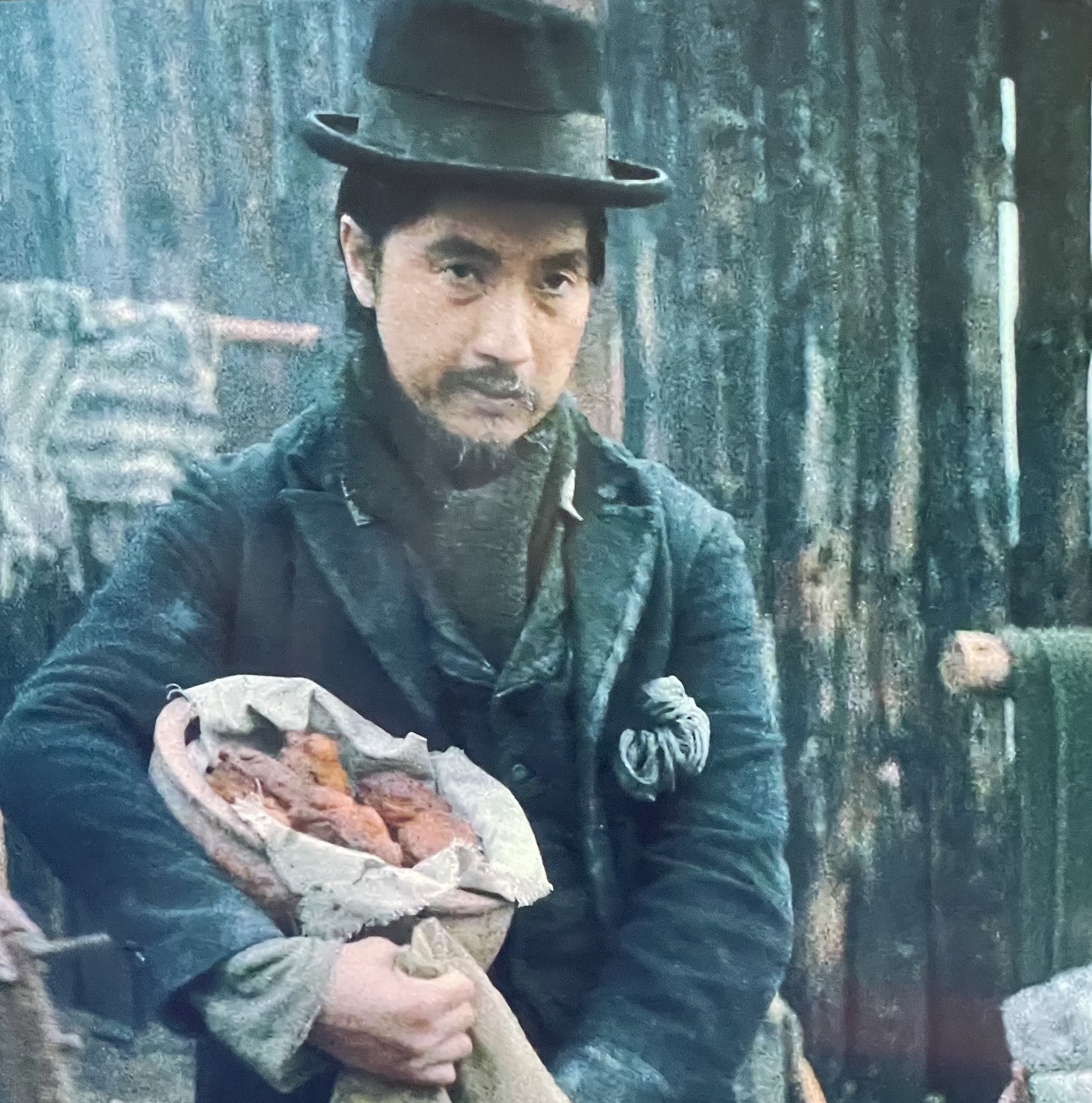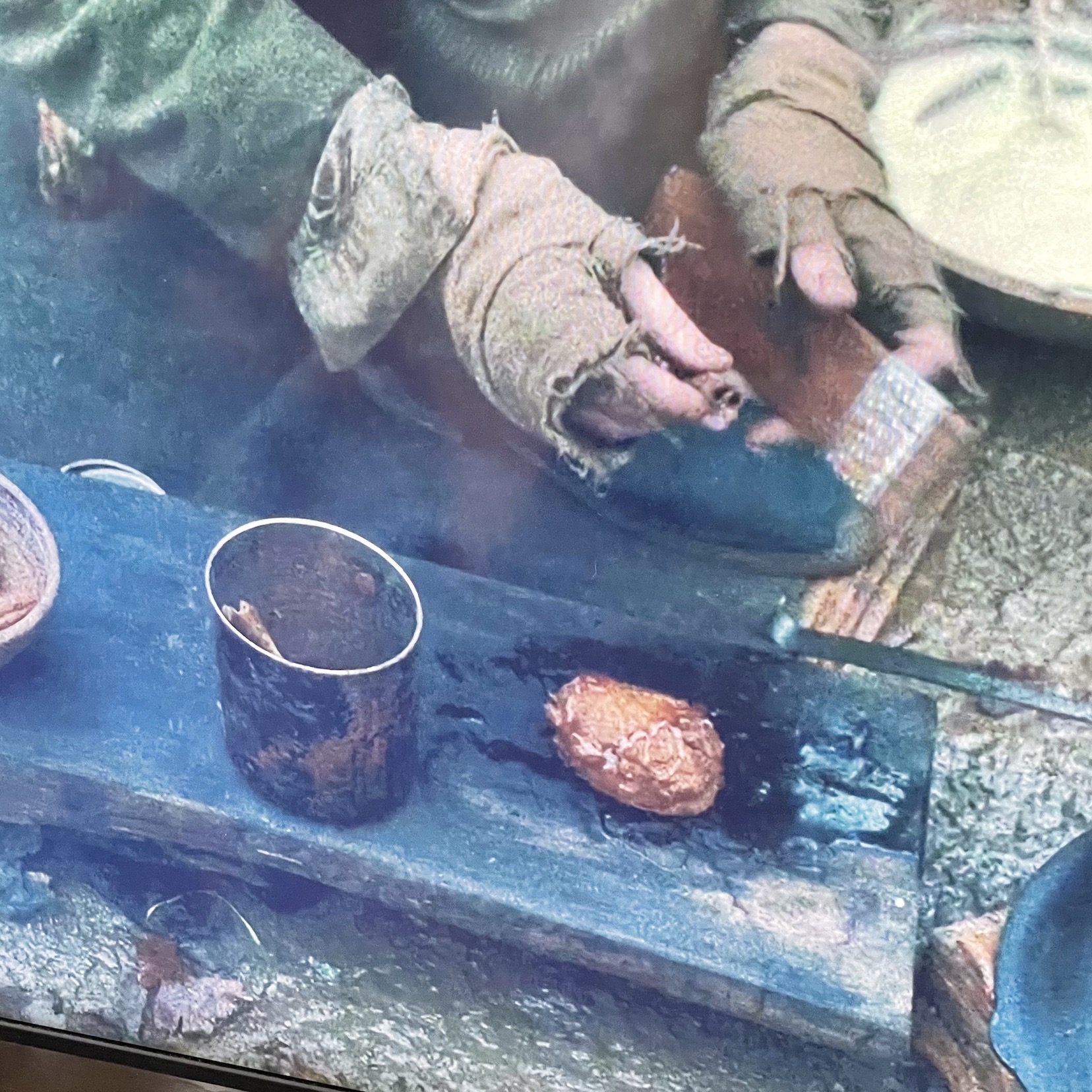 Cookie and King-lu come up with a scheme to make some money. During the night, Otis starts milking the cow in secret to make oily cakes (fritters fried in oil) and sell them to the trappers at the fort. King-lu is a good salesman, telling stories to potential customers about a secret Chinese ingredient that would explain the extraordinary taste. The men immediately fall in love with the cakes, line up to get them, and are ready to pay good money. As a matter of fact, they compete with each other and the prices go up. The movie avoids romanticizing food: while underlying its psychological power, it also reminds us that food is produced to be sold, it is part of the economy, and that it can easily be exploited to bamboozle potential clients. It is not just the good flavor (courtesy of the milk) that attracts customers: the men enjoy looking at Cookie making the cakes in front of them, smearing honey and grating cinnamon on them. The sound of sizzling oil, the smell allow them to taste memories from home. Even the refined Chief Factor is immediately brought back to London when he savors his first bite of the simple dessert. The very fact that even in such a harsh environment men are ready to pay good money for a sweet, something that is far from necessary, underline both the emotional power and the economic potential of food.
