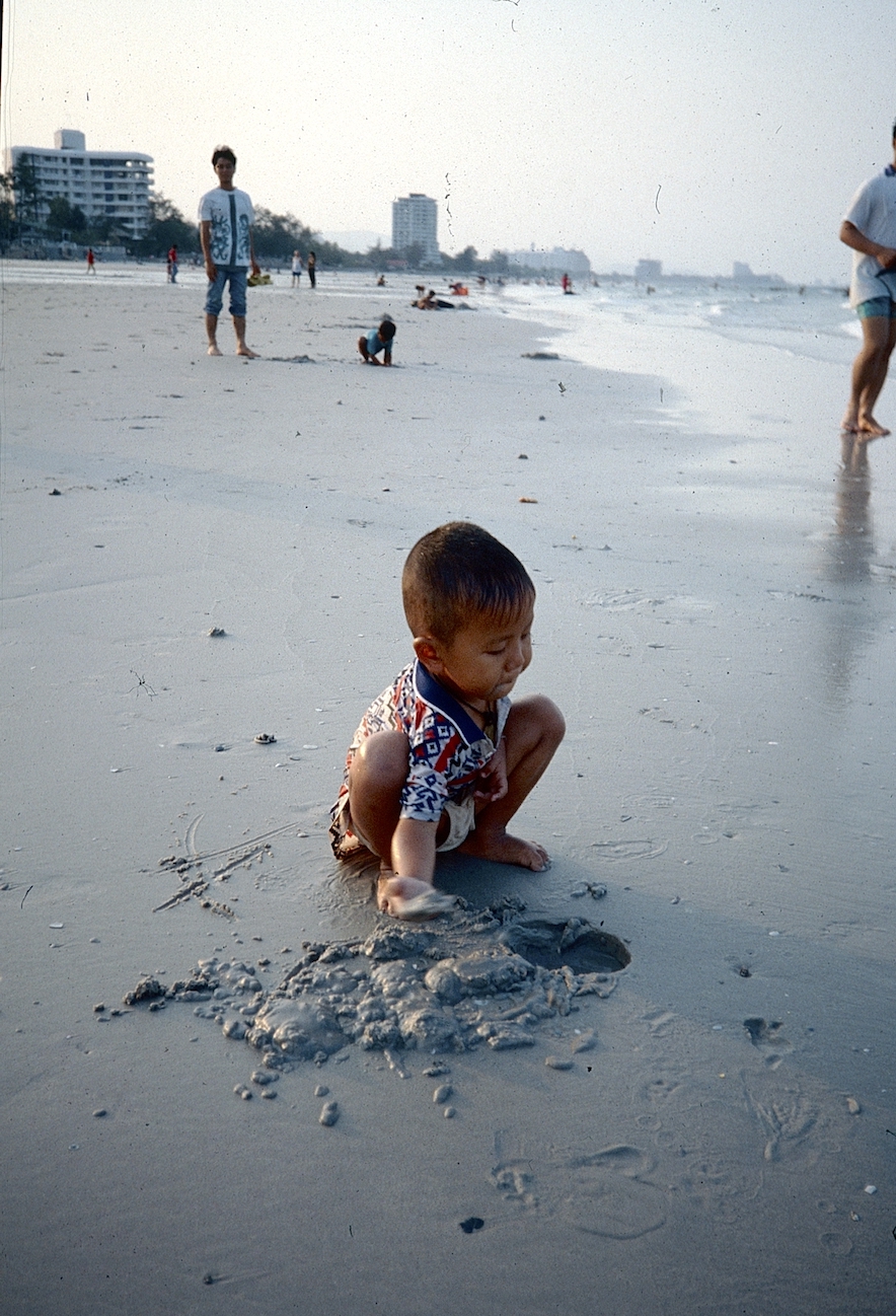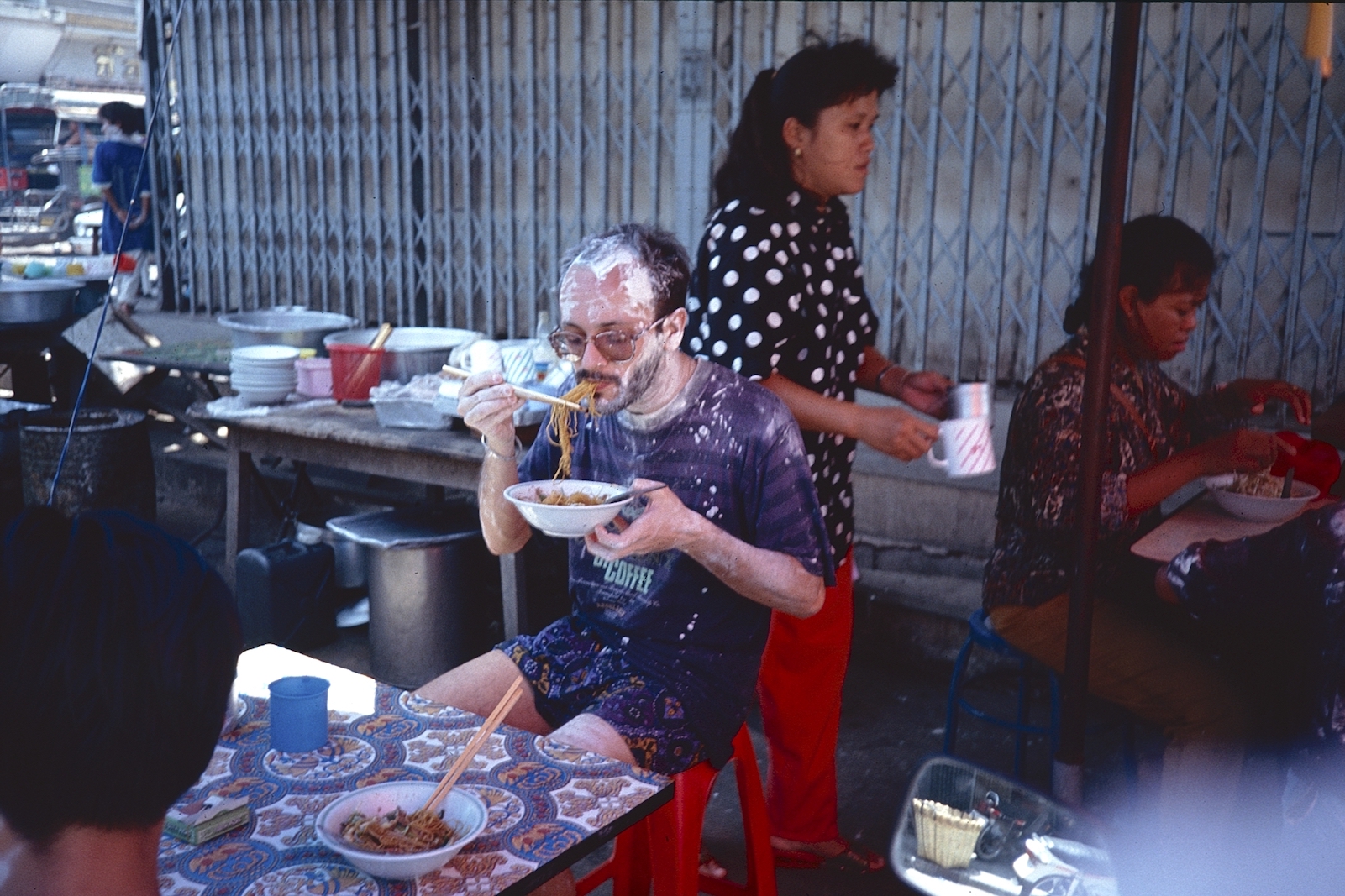 There I am, slurping a bowl of noodles. I am covered in some white stuff, and so are the two guys sharing the table with me. On the table, the usual paraphernalia for this kind of street food in Thailand: spoons, chopsticks, sauces. We are under a tarp, in the shade. In the sun, the temperature must be quite hot, as suggested by the sharp contrast between the dark and the bright parts of the picture. Hard to take photos in those conditions… And I did not take. somebody else did, using my camera, as i still have the picture. There is a lady in the back who seems to be cooking, and another table of customers, wearing more formal clothes than I am. On the frame of this slide I had written “Hua Hin:” it is a beach resort town in the Thai part of the Malay peninsula. No date, but when I saw this picture I remembered a trip I took with a bunch of guys I had met in Bangkok. I can presume it was 1993 or 1994, in one of my early trips to Thailand.